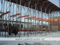 Опционально можно изготовить такие стеллажи для размещения их под открытым небом. В таком случае стеллажная конструкция оснащается специальным навесом на основе ферм с профнастилом. Это позволяет защитить хранимую продукцию от дождя или снега.